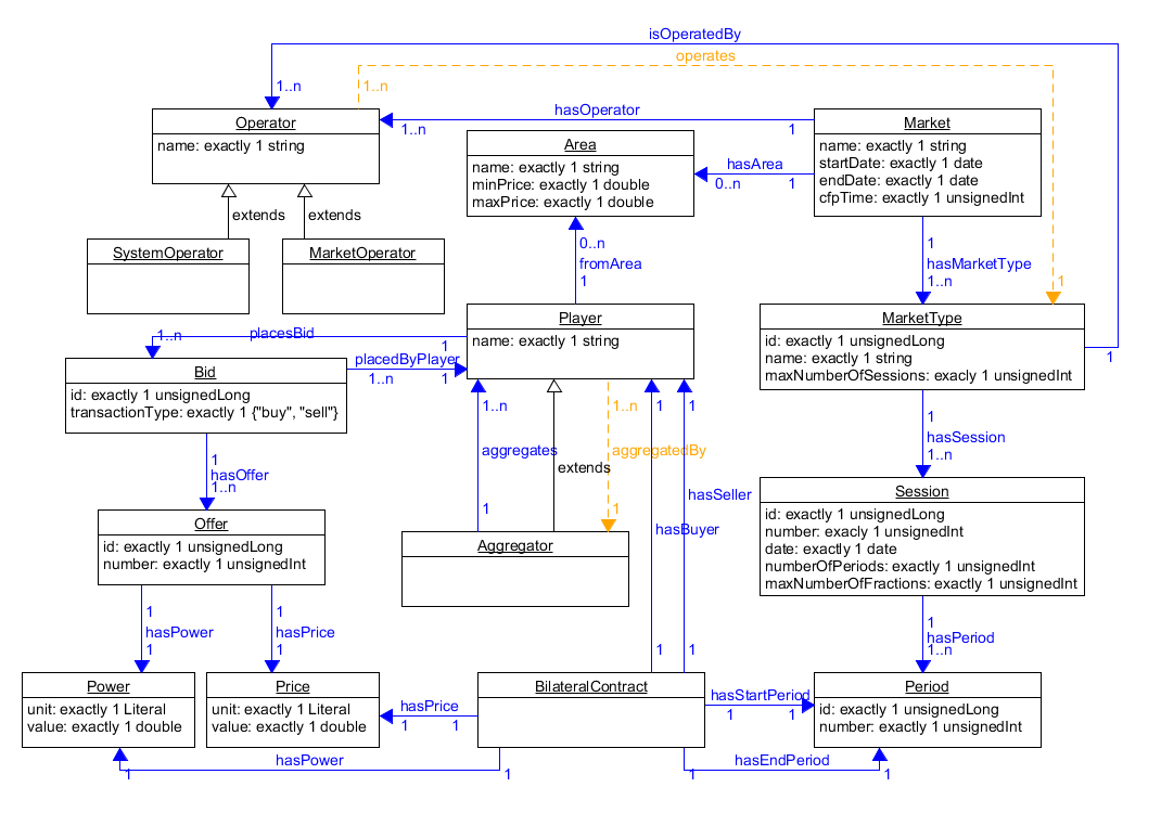 Analysing Figure 2 it is possible to see the object properties represented in blue and the data properties defined within each class with the respective data types. The orange relations represent the inferred object properties, which are inverse properties of the ones defined in blue in the opposite direction. It should be noticed that three object properties defined in this ontology are not present in the diagram, namely: hasBilateralContract, placedInPeriod and placedInSinglePeriod. These are important properties that are introduced in EMO to be reused after by the ontologies defined by each electricity market’s domain.