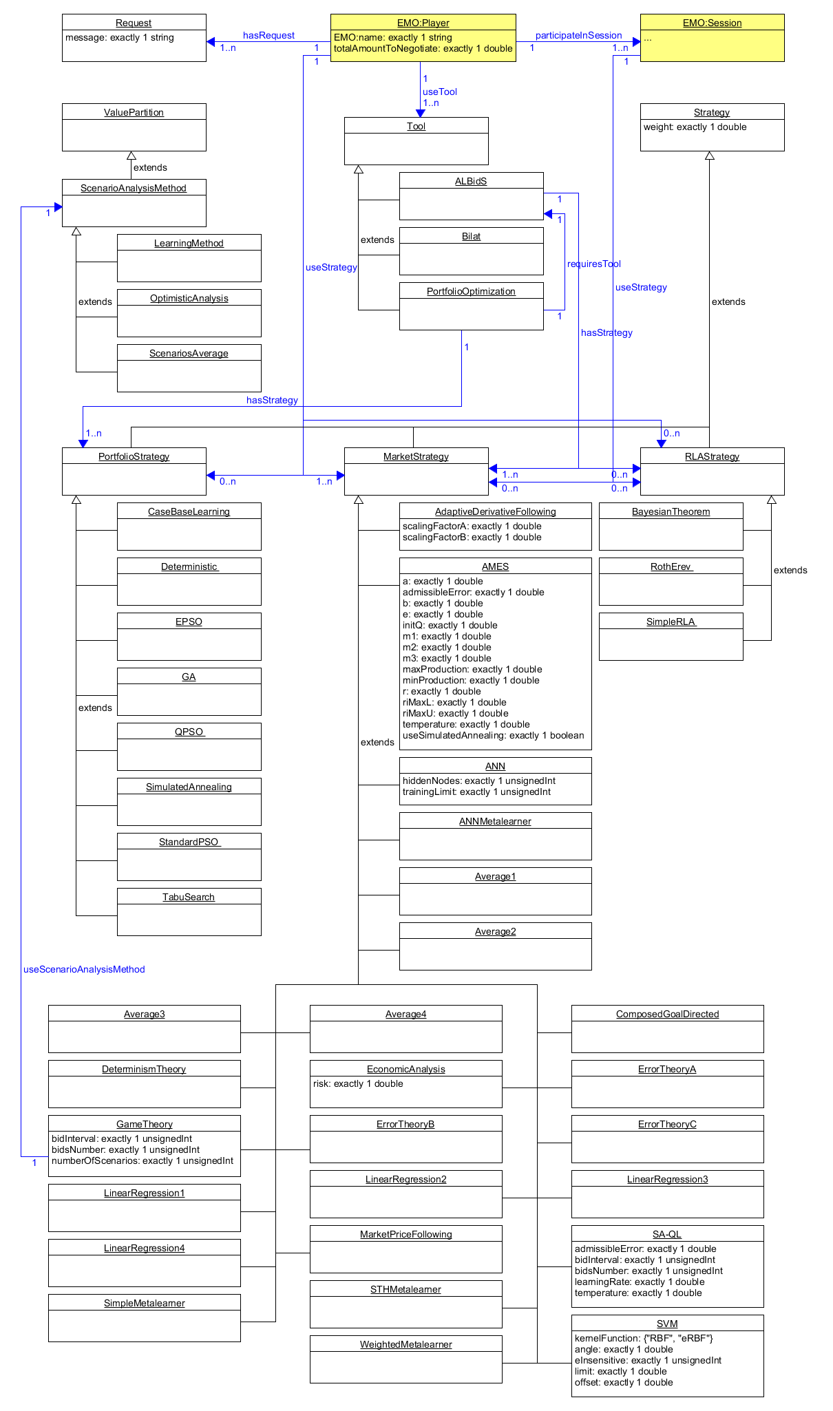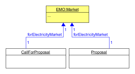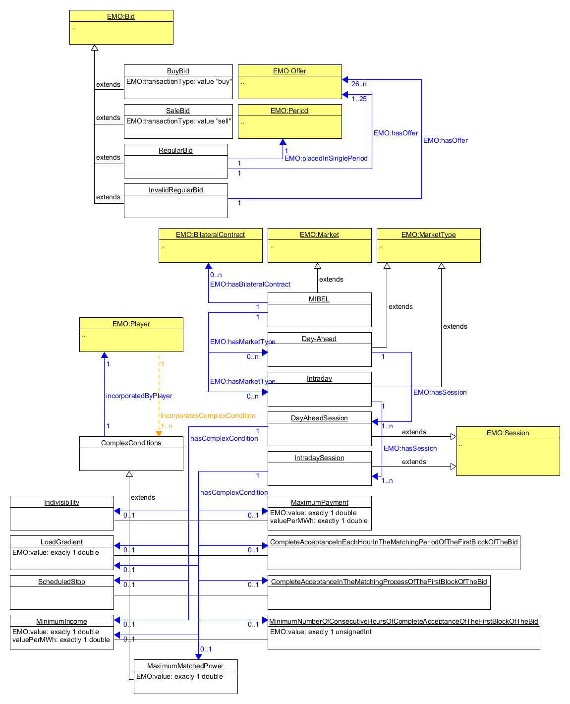 As expressed before, the classes imported from the EMO are in yellow, while the object properties are represented in blue. In order to use this ontology, it should be noted that the CallForProposal class is used by the market operators agents to inform players agents that a given market is about to begin and they should submit their proposals if willing to participate. In response to the call for proposal (CfP) each market player interested in participate in the market sends a Proposal to the market operator with the respective bids and complex offers, if desired.