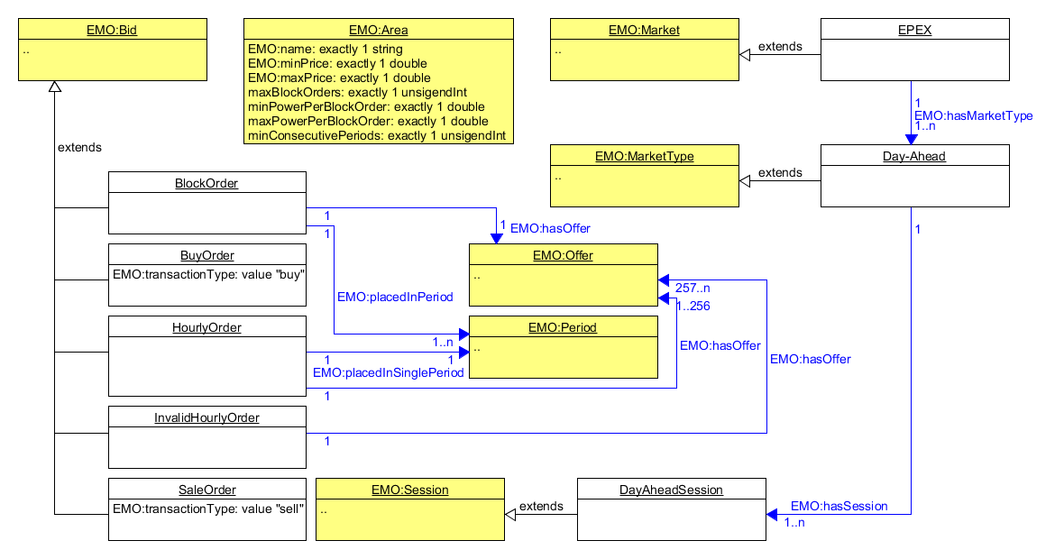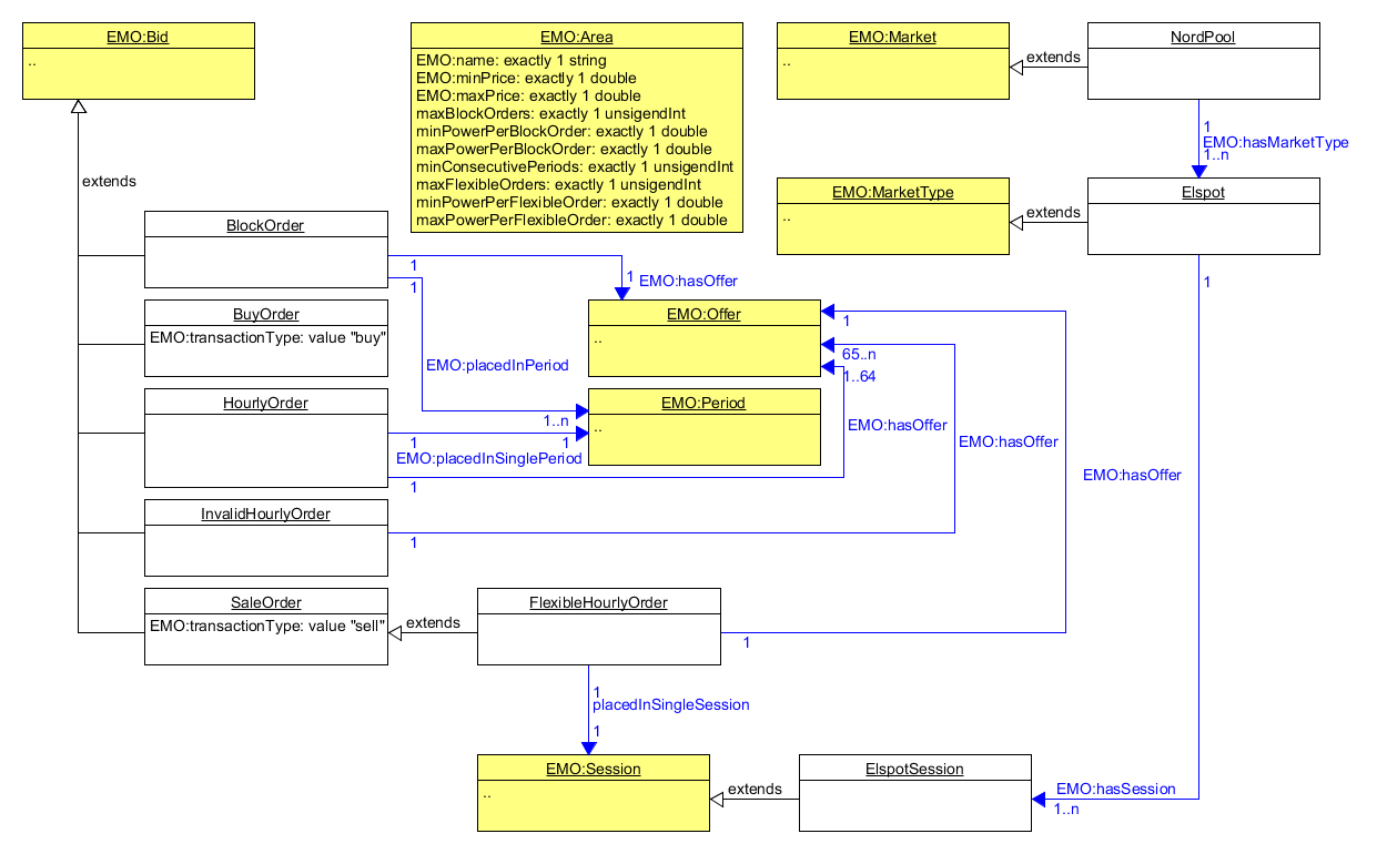 In yellow are illustrated the EMO’s concepts, and the prefix “EMO:” identifies EMO’s object and data properties. In blue are identified the object properties of both EMO and NPO. In NPO the EMO:Area includes the three new added data properties, besides the ones included in EPX. Another point to take into consideration is the FlexibleHourlyOrder which can only be placed in one single session.