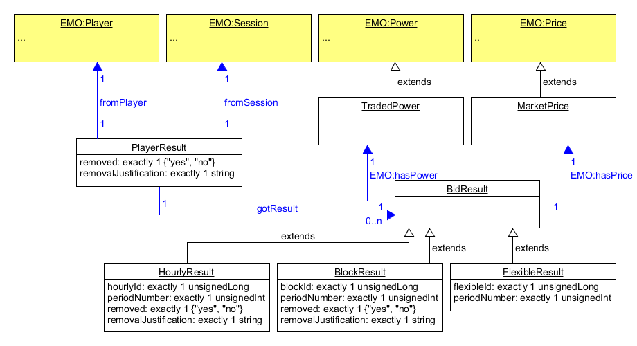 The Electricity Markets Results Ontology (EMR) ontology has been developed considering the output data each market provides its players. Given the simplicity and similarity of the several EM results, it has been decided to gather this knowledge in a single ontology. Figure 7 illustrates the concepts and properties of EMR and its relation to the EMO ontology.